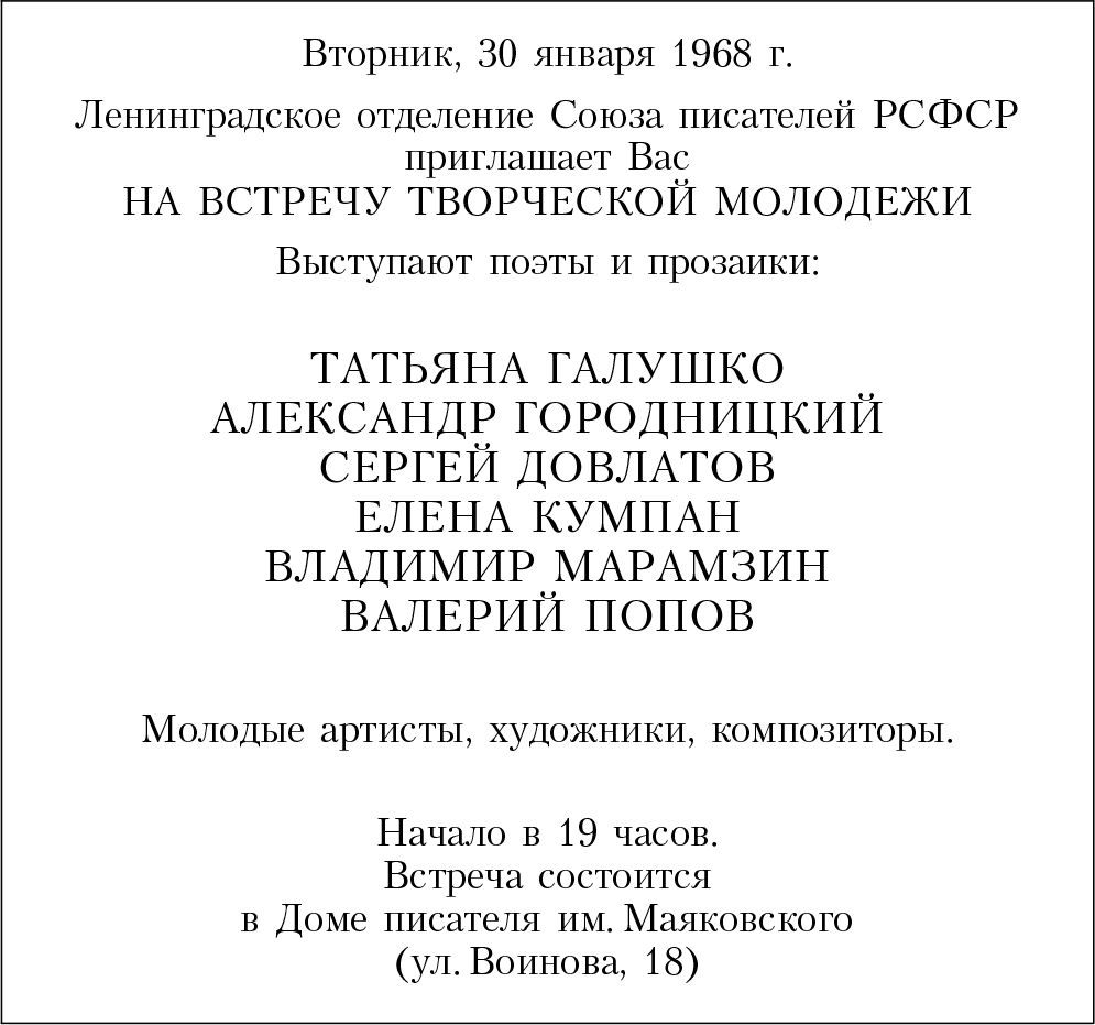 Кроме того, собирались выступить Бродский и Уфлянд. Их фамилий не указали.