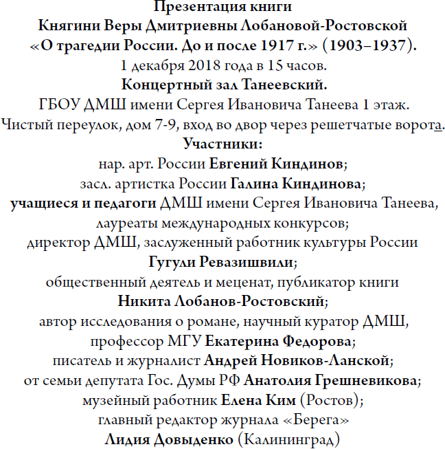 Никита Дмитриевич говорил в письме о «Записках матери»: «Ожидаю, что книга в двух томах выйдет из печати в издательстве “Минувшее” в декабре и будет в этом случае представлена на книжной ярмарке в Москве. Сейчас публикую фрагменты романа в журнале “Берега” в Калининграде. Роман о дореволюционной России и жизни после переворота моей бабушки княгини Веры Дмитриевны Лобановой-Ростовской был издан в 1936 году в Болгарии.