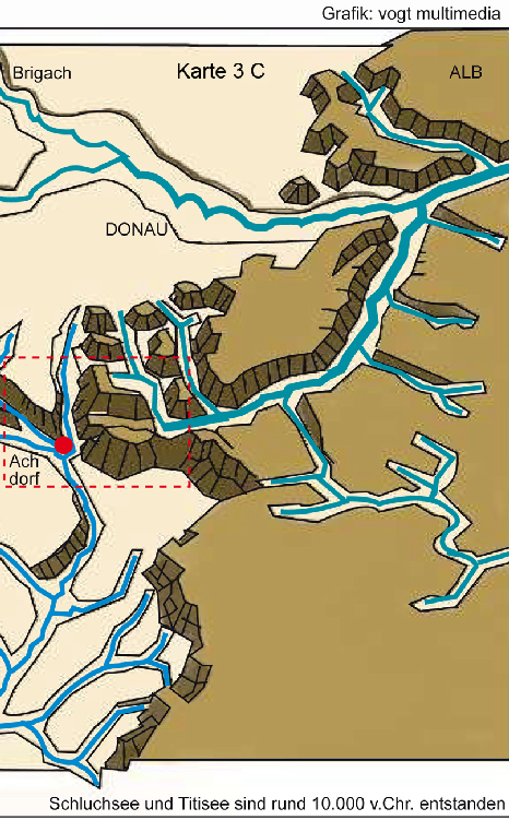 Beim Abschmelzen des Feldberg-Gletschers entstanden auch der Schluchsee und der Titisee. Auf der folgenden 3-teiligen Karte 3a-3c ist das gut zu sehen. Ursprünglich bestanden diese beiden Seen ausschließlich aus Gletscher-Schmelzwasser. Heute werden diese beiden Seen durch Niederschlagswasser, und im Frühling auch durch die Schneeschmelze befüllt.