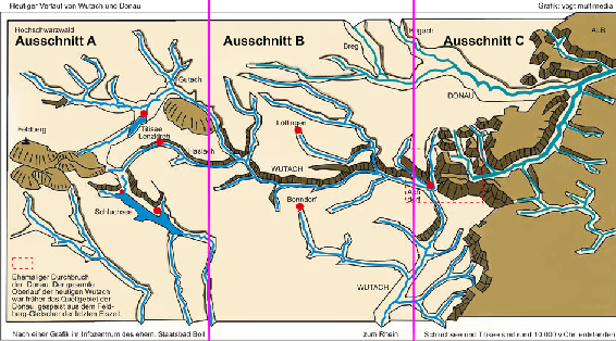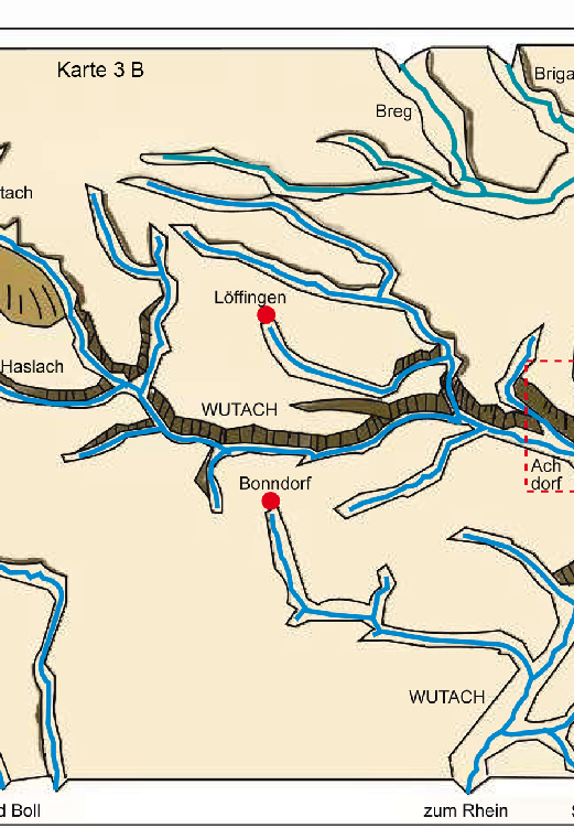 Auf den foilgenden 3 Seiten sehen Sie die Kartenausschnitte (Vergrößerungen) 3A bis 3C Die schwarzen Umrandungen neben den Flussläufen zeigen die tiefen EInschnitte (Einkerbungen) in die Landschaft an. Deutlich zu sehen ist, dass Donau, Wutach (Verbindung von Gutach und Wutach) und die Schwarza (Ausfluss des Schluchsees) ein jeweils eigenes Entwässerungssystem bilden, das durch die Landschaft und die Fließrichtung bestimmt wird. Nicht eingezeichnet ist der nur sehr kurze Schleiffenbach, der in Blumberg entspringt und in Achdorf in die Wutach fließt. In der Verlängerung stellt der Schleiffenbach, bis auf eine Unterbrechung von wenigen hundert Metern, die Verbindung zur Donau her, die damals in der letzten Eiszeit unterbrochen wurde. Man muss aber schon genau auf die Ausschnitte sehen, um die sehr nah beieinander liegenden Quellen den drei Flüssen zuzuordnen.