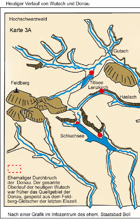 Der Titisee liegt auf 840m Höhe, ist 1,3 Qkm groß und 39m tief. Er gilt als beliebter Bade- und Ausflugssee. Weil der Titisee einen großen Teil des Wutach-Wassers liefert, ist er somit auch ein wichtiger Teil der Region Wutach / Schluchtensteig. Ein Besuch ist empfohlen, wenn man in der Region Wutach wandert. Die nächste Karte 3a-3C zeigt den heutigen Verlauf von Wutach-und Donau-Oberlauf seit der letzten Eiszeit.