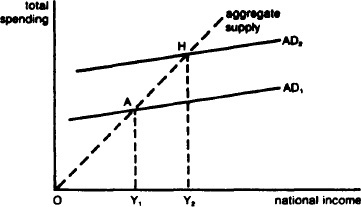 Fig. 25 Comparative static equilibrium analysis. The initial level of national income is Y1 (at point A) where the AGGREGATE DEMAND SCHEDULE (AD1) intersects the AGGREGATE SUPPLY SCHEDULE (AS).