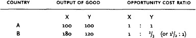 It can be seen that Country B has a comparative advantage in the production of Good X for it is able to produce it at a lower factor cost than Country A; the resource or opportunity cost of producing an additional unit of X is only ⅔ Y in Country B, whereas in Country A it is 1Y.