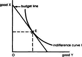 Fig. 30 Consumer equilibrium. The optimal combination of Good X and Good Y is at point E when the BUDGET LINE is tangential to indifference curve 1. At this point the slope of the budget line (the ratio of prices) is equal to the slope of the indifference curve (the ratio of marginal utilities), so the goods’ marginal utilities are proportional to their prices.