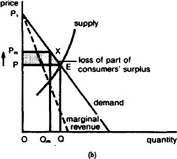 Fig. 32 Consumers’ surplus. (a) At the EQUILIBRIUM PRICE OP, utility from the marginal unit of the good is just equal to its price; all previous units yield an amount of utility that is greater than the amount paid by the consumer, insofar as consumers would have been prepared to pay more for these intramarginal units than the market price. The total consumer surplus is represented by the shaded area PEP1 (b)The loss of consumers’ surplus because of monopoly.