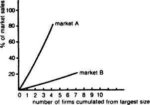 Fig. 29 Concentration ratio. Market A is here highly concentrated, with the four largest firms accounting for 80% of market sales, while market B has a relatively low level of concentration.