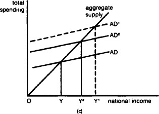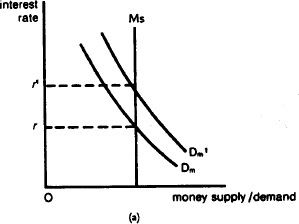 Fig. 34 Crowding-out effect. (a) An increase in government expenditure raises real NATIONAL INCOME and output (see EQUILIBRIUM LEVEL OF NATIONAL INCOME), which in turn increases the demand for money from Dm to Dm1, with which to purchase the greater volume of goods and services being produced. (b) This causes the equilibrium INTEREST RATE to rise (from r to r1), which then reduces – ‘crowds out’ – an amount of private INVESTMENT (ΔT). (c) An increase in government expenditure by itself would increase AGGREGATE DEMAND from AD to AD1, but, allowing for the fall in private investment, the net result is to increase aggregate demand to only AD2.