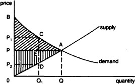 deadweight loss the reduction in CONSUMERS’ SURPLUS and PRODUCERS’ SURPLUS that results when the output of a product is restricted to less than the optimum efficient level that would prevail under PERFECT COMPETITION. Fig. 36 shows the demand and supply curves for a product, and their interaction establishes the equilibrium market price OP. At this price, consumers’ surplus is shown as the diagonally shaded area ABP and producers’ surplus as the vertically shaded area APO. If output is restricted from OQ to OQ1, then the price paid by consumers would rise to OP1 and consumers’ surplus would be reduced by the amount ACE, while the price received by producers would fall to OP2 and producers’ surplus would be reduced by the amount ADE.
