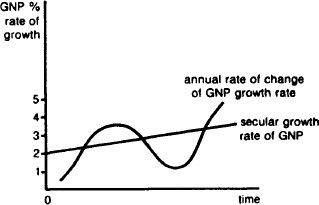 Fig. 35 Cyclical fluctuation. The pronounced short-term swings in output growth rates over the course of the BUSINESS CYCLE, around a rising long-term trend growth line for the country’s GROSS NATIONAL PRODUCT.