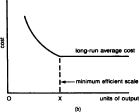 Empirical studies of companies’ long-run average-cost curves, however, suggest that diseconomies of scale are rarely encountered within the typical output ranges over which companies operate, so that most companies’ average cost curves are L-shaped, as in Fig. 10 (b). In cases where diseconomies of scale are encountered, the MINIMUM EFFICIENT SCALE at which a company will operate corresponds to the minimum point of the long-run average cost curve (Fig. 10 (a)). Where diseconomies of scale are not encountered within the typical output range, minimum efficient scale corresponds with the output at which economies of scale are exhausted and constant returns to scale begin (Fig. 10 (b)). Compare AVERAGE COST (SHORT-RUN).