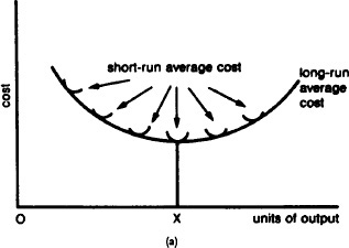 average cost (long-run) the unit cost (TOTAL COST divided by number of units produced) of producing outputs for plants of different sizes. The position of the SHORT-RUN average total cost (ATC) curve depends on its existing size of plant. In the long run, a firm can alter the size of its plant. Each plant size corresponds to a different U-shaped short-run ATC curve. As the firm expands its scale of operation, it moves from one curve to another. The path along which the firm expands – the LONG-RUN ATC curve – is thus the envelope curve of all the possible short-run ATC curves. See Fig. 10 (a).
