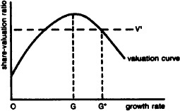 Fig. 9 Asset-growth maximization. The variation of share valuation ratio against the company growth rate.