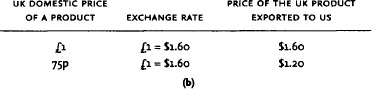 (a) external price adjustments. Alterations in the EXCHANGE RATE between currencies involving (depending upon the particular exchange-rate system in operation) the DEVALUATION/DEPRECIATION and REVALUATION/APPRECIATION of the currencies concerned to make exports cheaper/more expensive and imports dearer/less expensive in foreign currency terms. For example, with regard to exports, in Fig. 14 (a), if the pound-dollar exchange rate is devalued from $1.60 to $1.40 then this would allow British exporters to reduce their prices by a similar amount, thus increasing their price competitiveness in the American market.
