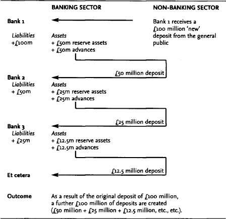 bank deposit creation or credit creation or money multiplier the ability of the COMMERCIAL BANK system to create new bank deposits and hence increase the MONEY SUPPLY. Commercial banks accept deposits of CURRENCY from the general public. Some of this money is retained by the banks to meet day-to-day withdrawals (see RESERVE-ASSET RATIO). The remainder of the money is used to make loans or is invested. When a bank on-lends, it creates additional deposits in favour of borrowers. The amount of new deposits the banking system as a whole can create depends on the magnitude of the reserve-asset ratio. In the example set out in Fig. 15, the banks are assumed to operate with a 50% reserve-asset ratio: Bank 1 receives initial deposits of £100 million from the general public. It keeps £50 million for liquidity purposes and on-lends £50 million. This £50 million, when spent, is redeposited with Bank 2; Bank 2 keeps £25 million as part of its reserve assets and on-lends £25 million; and so on. Thus, as a result of an initial deposit of £100 million, the banking system has been able to ‘create’ an additional £100 million of new deposits.