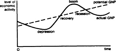 business cycle or trade cycle fluctuations in the level of economic activity (ACTUAL GROSS NATIONAL PRODUCT), alternating between periods of depression and boom conditions.