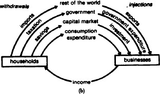 Fig. 22 Circular flow of national income model. (a) The basic model of the relationship between money flows and physical flows. (b) A more complex model, incorporating injections to and withdrawals from the income flow.