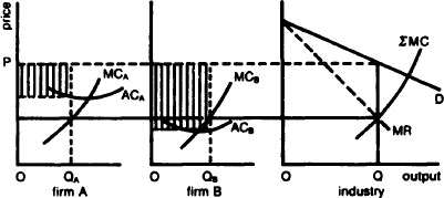 Fig. 21 Cartel. D is the industry demand curve, showing the aggregate quality that the combined group may sell over a range of possible prices and MR is the industry marginal revenue curve. The industry marginal cost curve ΣMC is constructed from the marginal cost curves of the individual firms making up the cartel. For any given level of industry output, the cartel is required to calculate the allocation of the output among member firms on the basis of their individual marginal costs to obtain the lowest possible aggregate cost of producing their output. To maximize industry profit, the cartel will set price OP and produce output OQ. Quotas of QA and QB are given to firms A and B respectively where a horizontal line drawn from the intersection of MR and ΣMC (the line of aggregate marginal costs) intersects MCA and MCB. Profit contributed by each firm is computed by multiplying the number of units produced by the difference between industry price and the firm’s average cost at that level of output. The aggregate profit is then divided among the member firms in some agreed manner, not necessarily, it is to be noted, in the same proportion as actually contributed by each of the individual firms. Disputes over the sharing of aggregate profit frequently lead to the break-up of cartels.