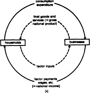 circular flow of national income model a simplified exposition of money and physical or real flows through the economy that serves as the basis for macroeconomic analysis. In Fig. 22 (a) the solid lines show how, in monetary terms, HOUSEHOLDS purchase goods and services from BUSINESSES using income received from supplying factor inputs to businesses (CONSUMPTION EXPENDITURE). In physical terms (shown by the broken lines), businesses produce goods and services using factor inputs supplied to them by households.