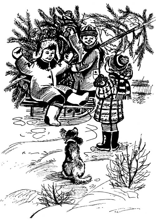 Недавно мы гуляли во дворе: Алёнка, Мишка и я. Вдруг во двор въехал грузовик. А на нём лежит ёлка. Мы побежали за машиной. Вот она подъехала к домоуправлению, остановилась, и шофёр с нашим дворником стали ёлку выгружать. Они кричали друг на друга: