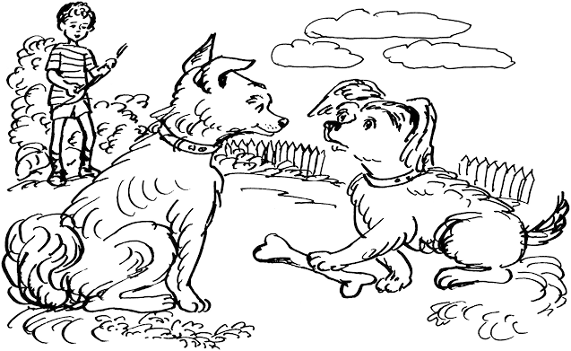 Но все дело было в том, что Антон уже давно был у нас на дворе. И как только Дымка занялась Мурзиком, Антон довольно ловко цапнул ее кость и удрал! Куда он девал кость, не знаю, но только через секунду приковылял обратно и сидит себе, посматривает: «Я, ребята, ничего не знаю».