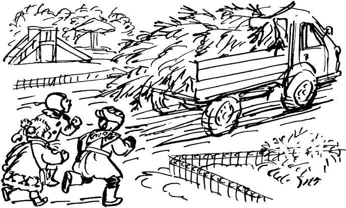 Недавно мы гуляли во дворе: Аленка, Мишка и я. Вдруг во двор въехал грузовик. А на нем лежит елка. Мы побежали за машиной. Вот она подъехала к домоуправлению, остановилась, и шофер с нашим дворником стали елку выгружать. Они кричали друг на друга: