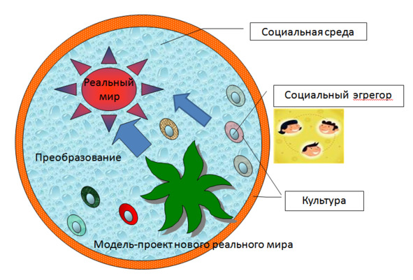 Рисунок 2. Общее представление работы социально-культурного интеллекта по преобразованию реального мира на основе социальных концепций и инноваций