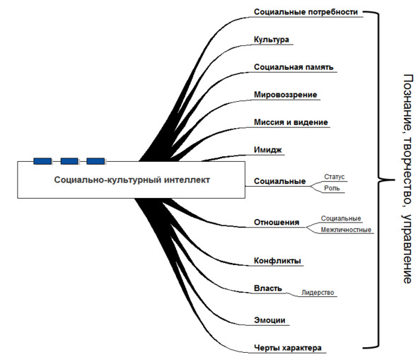 В структуру социально-культурного интеллекта входят разнородные объекты, которые являются и внутренним содержанием психики человека, и сущностями, явлениями, которые определяют его характеристики в социуме. Работа (функции, задачи) социально-культурного интеллекта направлена на познание, творческое преобразование и управление этими составляющими.