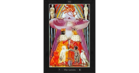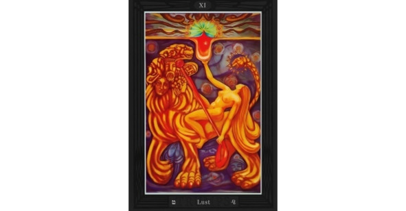 У этих авторов Кроули нашел некоторое сходство их взглядов на бессознательное и самость со своим учением о воле. Оно было им сформулировано вот таким образом: «Твори свою волю, таков да будет весь закон». Из этих двоих авторов Алистер Кроули больше уважал Карла Юнга за то, что у него воля является доминирующей, а из нее уже вытекает секс. У Фрейда же, наоборот, в центре концепции был секс. Кроули не одобрял такой подход. Поэтому в его колоде как раз таки появляется карта Вожделение – это Аркан высшей сексуальной энергии и экстаза, который при этом подчинен воле и служит для духовного обогащения, это еще и высший космический принцип сочетания женского и мужского (Рис. 16). В Таро Тота он заменяет Аркан Сила.