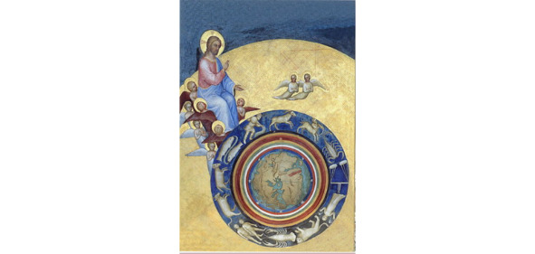 Обратите внимание на похожую сюжетом фреску XIV века. Она создана раньше, чем Золотое Флорентийское Таро. Здесь мы тоже видим мир, состоящий из нескольких сфер. Здесь, как и на Аркане Мир, небосвод отделен от Земли, и Бог возвышается над своим творением, буквально стоит на нем (Рис. 19).