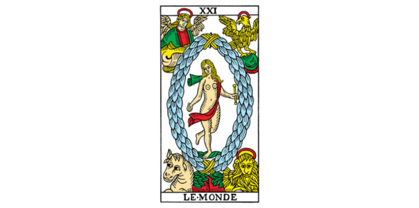 На Марсельское Таро сильно повлияла алхимия, и в нем 4 элемента представлены в виде животных: Бык – земля, Орел – воздух, Лев – огонь, Ангел – Дух. В центре карты находится человек, как венец божественного творения. Вокруг него находится Уроборос, который напоминает нам о цикличности жизни и смерти. Это тоже переосмысление сотворения мира, но главное Творение здесь – человек (Рис. 20).