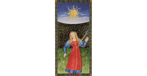 На Аркане Солнце мы видим пряху. Она могла прясть лишь в дневное время, ведь без света ночью это было бы очень проблематично (Рис. 24). Пряха олицетворяет не только время, она может говорить и о важности одежды для древних людей, которая давала тепло точно так же, как и Солнце.