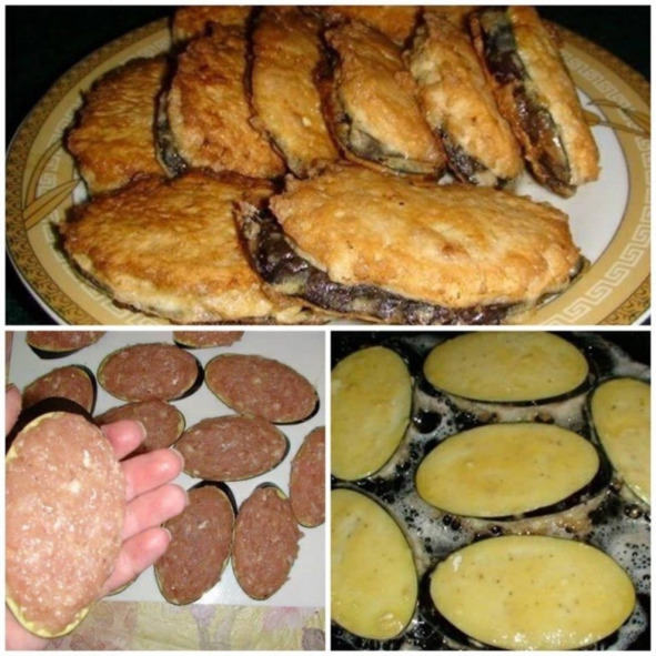 Разогреть масло в сковороде, обжарить баклажаны фаршем вниз.