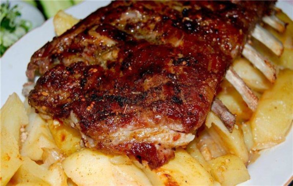 Выложить в рукав для запекания картошку, сверху ребрышки. Завязать края рукава и выложить на противень. Готовить в разогретой духовке в течение часа, температура – 200 градусов.