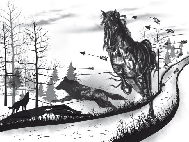 Случается нелёгкая —Погода неполётная,А вьюга жжёт жестокая,Холодная, голодная.Бежала от погониЛошадка одинокая,Как от грозы бедовойИ рукавиц ежовых.За нею гнались орды,Зубастые торпеды,Волчицы кровожадные,Нещадные и жадные —Кусок отведать жирный,Напиться и упиться,Зубами расплодиться.Их пасти открывалисьИ с жалом выпускались.Сверкали тучей грозноюСолдаты остроносые —С кинжалами, ножами,С когтями и рогами,И с копьями, мечами … —И всё им было мало,Что под руку попало.Сверкали и стреляли,Как тучи проливные,И пушки огневые,Пылая, ослеплялиИ стрелы выпускали.