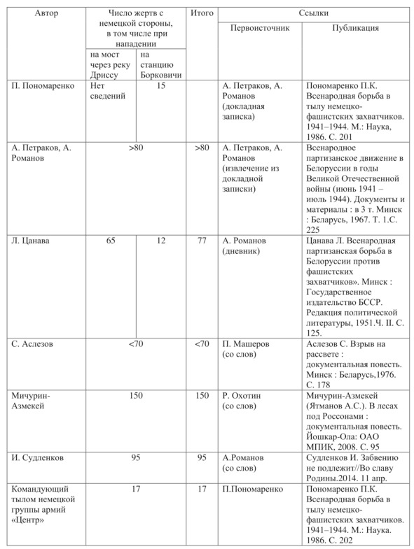 Вот так ее рассказывали в 2008 году: «К разгару ожесточенного боя успел подойти Степан Голубьев с подрывниками. Он без особых сложностей бросил в воду трос с привязанными к его концам камнями, закрепил под мостом плот. Подрывники очень быстро подняли и подвесили на основной пролет моста четыреста килограммов тола. Я поджигаю шнур, прыгайте в воду!» – дал команду командир. А на берегу идет бой. В окна казарм, где спрятались немцы, полетели гранаты. И только тогда стрельба ослабела. Вдруг раздался очень сильный взрыв, который всех успокоил. В воздух, как щепки, полетели сломанные рельсы, шпалы. Концы моста, как крылья раненой птицы, повисли и упали в воду… Командир Дубняк-Машеров был легко ранен в бою, а подрывника Голубьева контузило, когда он плыл по реке. Взрывной волной его выбросило на берег. И все-таки немецкий гарнизон из ста пятидесяти человек был уничтожен, и враг на долгое время замолчал»168. Как говорится, без комментариев… Или так рождаются мифы.
