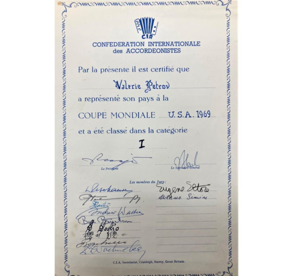 С конкурса в Нью-Йорке он привез Диплом лауреата первой премии, выданный Международной конфедерацией аккордеонистов.