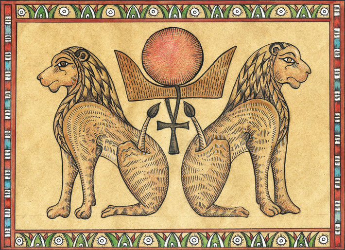 АКЕРАкер – одно из древнейших божеств Египта, покровитель умерших и повелитель земли. Он – та линия горизонта, что отделяет небо от земли, а день от ночи. Акера изображали так: узкая черта, символизирующая полосу земли, из-за которой встает солнце, с двух сторон ее поддерживает пара львов, чьи головы смотрят в разные стороны. Позднее Акера представляли как льва с двумя головами и двумя парами передних лап. Одного из львов-близнецов звали Дуадж, что в переводе значило «вчера», а другого – Сефер, то есть «завтра». Впервые этот емкий и яркий образ божества встречается в древнем погребальном «Тексте пирамид», написанном примерно за два тысячелетия до нашей эры. Согласно мифу, Акер охранял вход в царство мертвых и сумел защитить покойного правителя от ядовитого дыхания трех змей-демонов. В более поздних версиях Акер стал стражем и перевозчиком солнечного бога Ра, охраняя его во время ночных путешествий от слуг Апопа – громадного змееподобного божества, олицетворявшего мрак, зло и хаос.