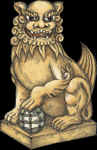 КОМАИНУВ Японии мифологический зверь комаину играл роль стража, а внешне напоминал помесь льва и собаки. Историки считают, что традиция устанавливать охранных львов у дверей появилась в Индии в третьем веке до нашей эры. Оттуда она перешла в Китай, а затем прочно укрепилась в японской культуре. С XV века статуи комаину начали ставить у дверей в синтоистские и буддийские храмы – всегда парами, чтобы те охраняли священное место от злых духов. Существует несколько вариантов создания комаину – в манере Эдо, Окадзаки или Идзумо. В стиле Нанива собакольвов обычно изображают сидящими, при этом одна из лап комаину покоится на шаре. Китайский вариант этой скульптуры называется «ши-цза», пару таких львов-стражей, высеченных из гранита, можно увидеть в Санкт-Петербурге при спуске к Неве на Петровской набережной.