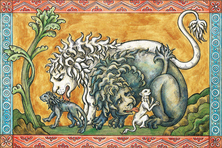 Римский писатель Элиан в трактате «О природе животных» утверждает, что во львах слишком много тепла и потому они боятся огня. К тому же «из всех животных только лев рождается с открытыми глазами, как будто он уже как бы снабжен пылкостью и с самого момента рождения стремится сделать что-либо благородное». Плиний Старший утверждал, что из всех диких животных лишь лев способен снизойти к мольбам и помиловать человека, он описывал душевное благородство льва, его храбрость и прозорливость. На самом деле львы не так уж благородны и благодетельны. Это хищники, сильные и опасные. Если лев будет голодать и не сможет найти обычную добычу, то вполне может напасть на человека – никакие мольбы не помогут, людям придется спасаться бегством или отгонять животное огнем. Плиний упоминает, что львы боятся пламени, кроме того, по его мнению, «столь необыкновенного и столь жестокого зверя пугают крутящиеся колеса и пустые повозки, а еще больше – петушиные гребни и крики». По мнению Плиния, львы подвержены лишь одному недугу – отвращению к пище, и «излечить от этого можно, лишь оскорбив их». Как ни странно, лекарством от отсутствия аппетита может стать кровь обезьян. В природе львы – естественные враги бабуинов и павианов, они охотятся на обезьян и питаются их мясом. Если воспринимать эту ситуацию не как факт, а символически, то многое становится понятным. Львов считали смелыми и открытыми, а обезьян – коварными и глупыми. Лев, поедающий обезьяну, показывает свое превосходство, а то, что ее кровь оказывается для царя зверей лекарством, может означать, что мудрецы вполне способны общаться с глупцами не без пользы для себя.