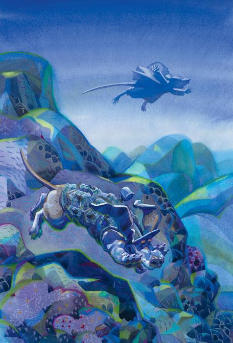 В это время мистер Мортимер, сумевший достаточно удачно осуществить приземление и по инерции продолжавший свой галоп, осознал, что груза на спине больше нет, и заставил себя оторвать взгляд от бегущей вниз тропы. Фарри, утяжелённый рюкзаком с поклажей, раскинув лапы в стороны, словно гигантская белка-летяга, намеревался приземлиться ниже по склону. Прикинув расстояние, мистер Мортимер несколько раз мощно оттолкнулся от земли и помчался вперёд ещё быстрее. Удар – и он с облегчением почувствовал острые когти, намертво вонзившиеся в его бока. Фарри сомкнул лапы с твёрдым намерением не разжимать их никогда. Он почти врос в продолжавшего нестись вниз с головокружительной скоростью мистера Мортимера и с облегчением закрыл глаза – самое страшное, похоже, было позади.
