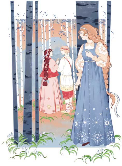 – Что горюешь, подружка? – забежала к Снегурочке соседка, красавица Купава. – Сейчас мой жених Мизгирь приедет! Идём скорее! – Купава потащила Снегурочку на улицу.