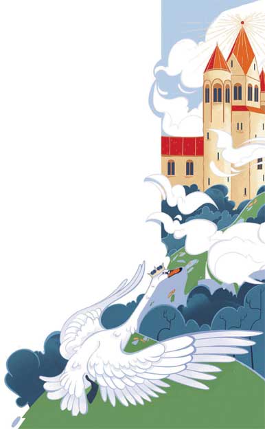 * * *А белый лебедь покружил-покружил над родными местами и полетел куда глаза глядят. Летел он долго-долго и вдруг увидел на вершине горы великолепный замок. С резными окнами, стрельчатыми башенками, украшенными драгоценными камнями. А на вершине самой высокой башни сиял огромный рубин.