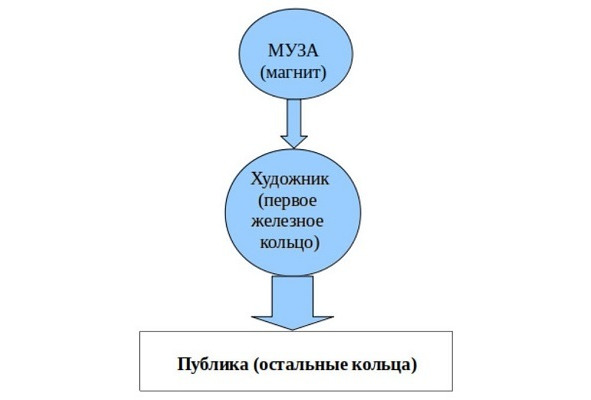 Известный диалог Платона «Ион» имеет прямое отношение к обсуждаемой теме. В нем, во-первых, утверждается и обосновывается исключительно высокая роль особых состояний в творческой работе художника и, во-вторых, выстраивается, говоря современным языком, такая модель художественного творчества и художественной коммуникации (здесь оба процесса оказываются абсолютно нерасчленимыми), где этому измененному состоянию принадлежит ключевая роль. Характеризуя состояние творческого вдохновения художника, актера и тот эффект, который производит их искусство на людей, Платон предлагает метафору магнита. Все знают, что магнит «не только притягивает железные кольца, но и сообщает им такую силу, что и они способны делать то же самое… то есть притягивать другие кольца, так что иногда получается очень длинная цепь из кусочков железа и колец, висящих одно за другим, и вся их сила зависит от того камня. Так и Муза – сама делает вдохновенными одних, а от них тянется цепь других, одержимых божественным вдохновением»6.