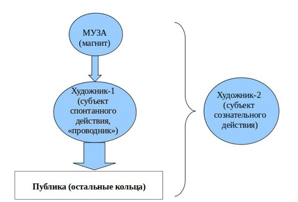 Как мы видим, она отличается тем, что в ней появился новый элемент – активное и сознательное «я» художника, который, с одной стороны, остается включенным в платоновскую схему и испытывает воздействие «Музы», с другой стороны, помещает себя вне этого механизма и оказывает на его работу свое управляющее воздействие («раздвоенность»). Это, собственно, и есть контролируемый художественный транс. В этой схеме один человек выступает в двух функциональных ролях: а) как субъект спонтанного действия, б) как субъект сознательного действия.