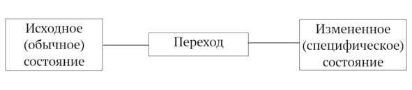 На практике под словом «транс» понимается или третий элемент этой схемы, то есть, измененное состояние, или второй элемент, то есть, собственно переход, движение от первого к третьему. Однако очевидно, что и то, и другое имеет смысл лишь при наличии первого элемента: измененное состояние является измененным относительно чего-то, а переход к чему-то есть одновременно переход от чего-то. Мы поэтому будем иметь в виду систему из трех элементов. Это не означает, что нам необходимо стремиться описывать «исходное» или «обычное» состояние с максимальной полнотой. Это, во-первых, невозможно, а во вторых и не нужно. Нам необходимо лишь задать те признаки «исходного» состояния, относительно которых будет удобно определить и описать изменения, сопутствующие переходу и собственные параметры измененного специфического состояния. Такое описание исходного состояния «с прицелом» на измененное (специфическое) означает, что мы концентрируем свое внимание, прежде всего, на моментах отличия одного от другого.