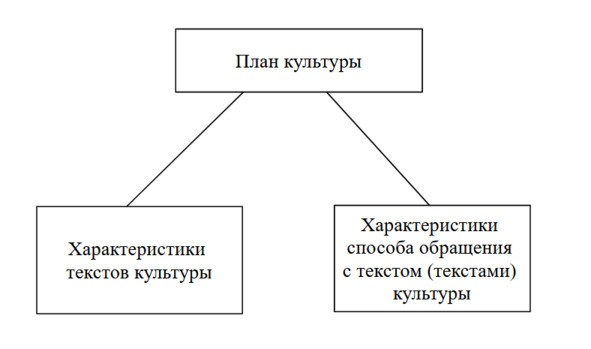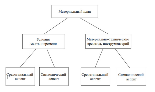 В том случае, если мы хотим сосредоточиться в большей степени на содержательных (ценностных, смысловых) аспектах исследуемых процессов, мы можем на какое-то время абстрагироваться от собственно материально-технического (средствиального) аспекта. В результате, некоторые материальные средства выпадут из нашего поля зрения, другие же останутся, но в специфически смысловом своем качестве. Тогда музыкальные инструменты, архитектурные сооружения и т. п. Оказываются особого рода текстами культуры и включаются в блок . В результате схема упрощается, квадрат (снова) превращается в треугольник: [1]