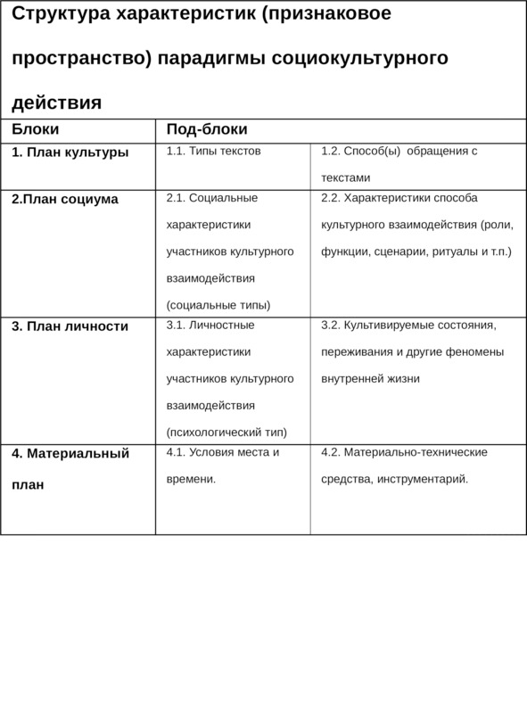 Итак, какое-то исходное представление о социокультурном действии, его сути, его составляющих, взаимодействии этих составляющих у нас есть. Представление, далеко не полное. Но вполне достаточное, чтобы, опираясь на него, двигаться дальше, переходя от предмета к его . уточнения исследованию