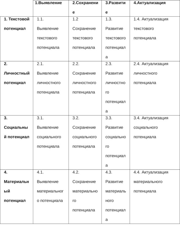Более детально это можно изобразить в виде таблицы (или в форме «дерева целей»), где каждое из направлений рассматривается по отношению к каждому из потенциалов в отдельности:
