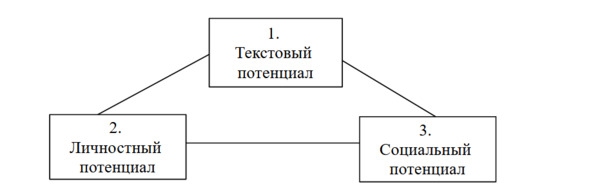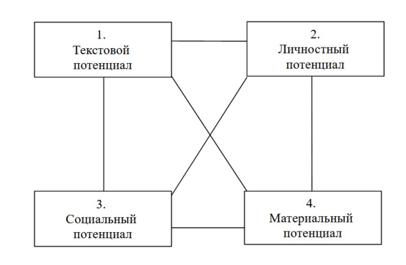 Начнем с того, что в процессе культурной жизни все четыре типа потенциалов культуры, так или иначе, вступают во взаимодействие. В этом взаимодействии каждый из них оказывается как-то связанным со всеми остальными. Схематически это можно изобразить следующим образом.