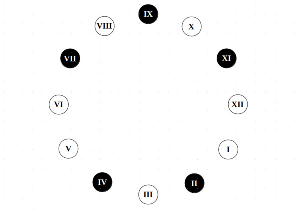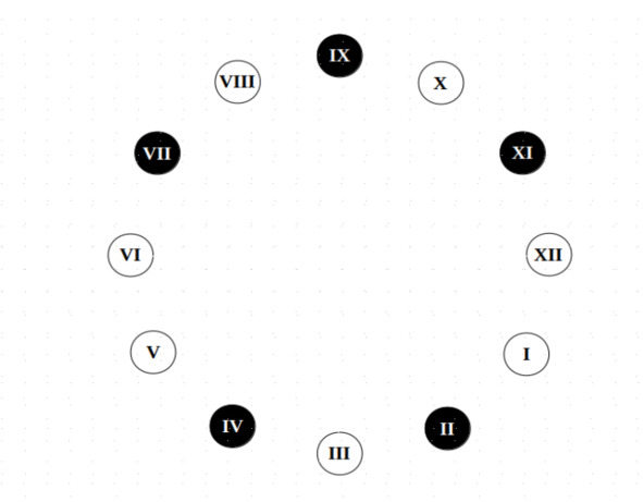 Черные кружочки на рисунке соответствуют черным клавишам фортепианной клавиатуры, образуя пентатонический звукоряд. Белые кружочки соответствуют белым клавишам и образуют семиступенную диатонику. Элементы VI и XII образуют тритон Фа – Си. Если исключить этот тритон их состава «белых» элементов и включить в группу «черных», то семиступенная диатоника превратится в пентатонику, а пентатоника превратится в семиступенную диатонику (например, в фа диез мажорную гамму). У нашего круга из 12 элементов (похожего на циферблат часов) есть 6 диаметров. Один из них (III—IX) является осью зеркальной симметрии (белый-белый, черный-черный):